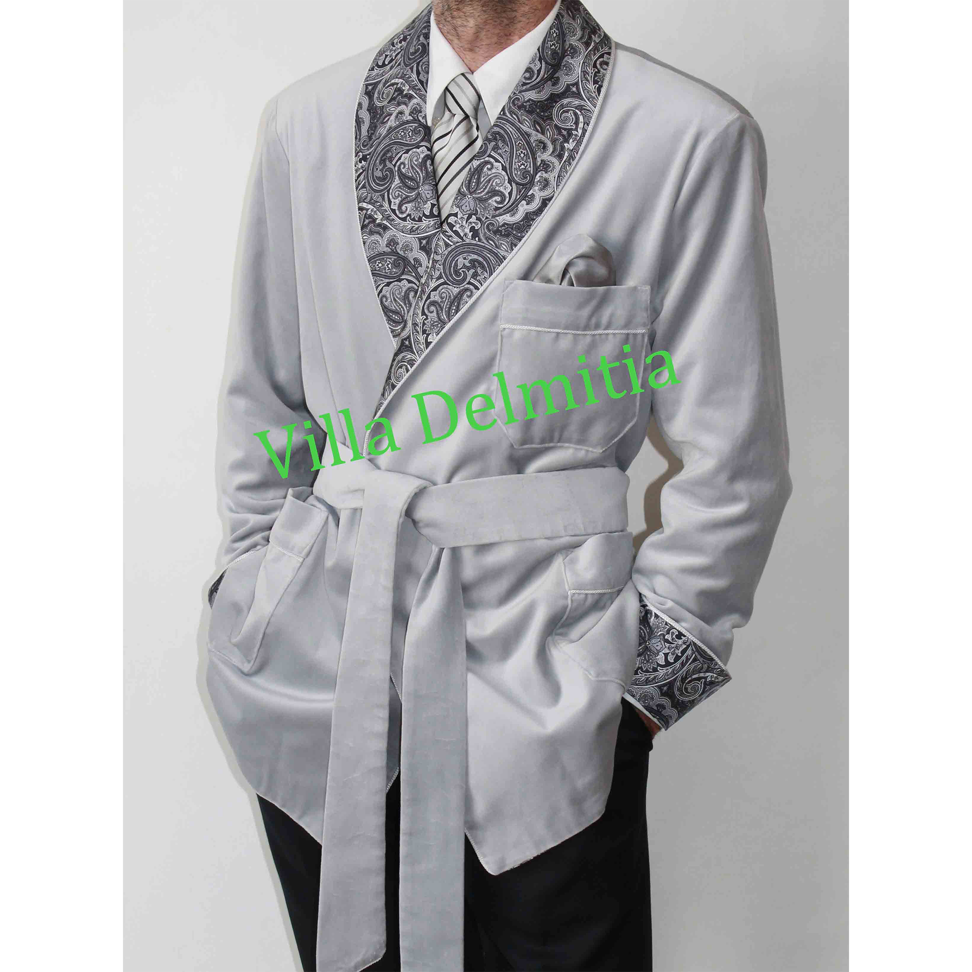 Veste d’intérieur classique en velours de coton couleur gris argent, avec contrastes en soie twill italienne 14 MM, dessin paisley en divers tons de gris, doublure Bemberg entière gris foncè et passepoil torsade coordonné